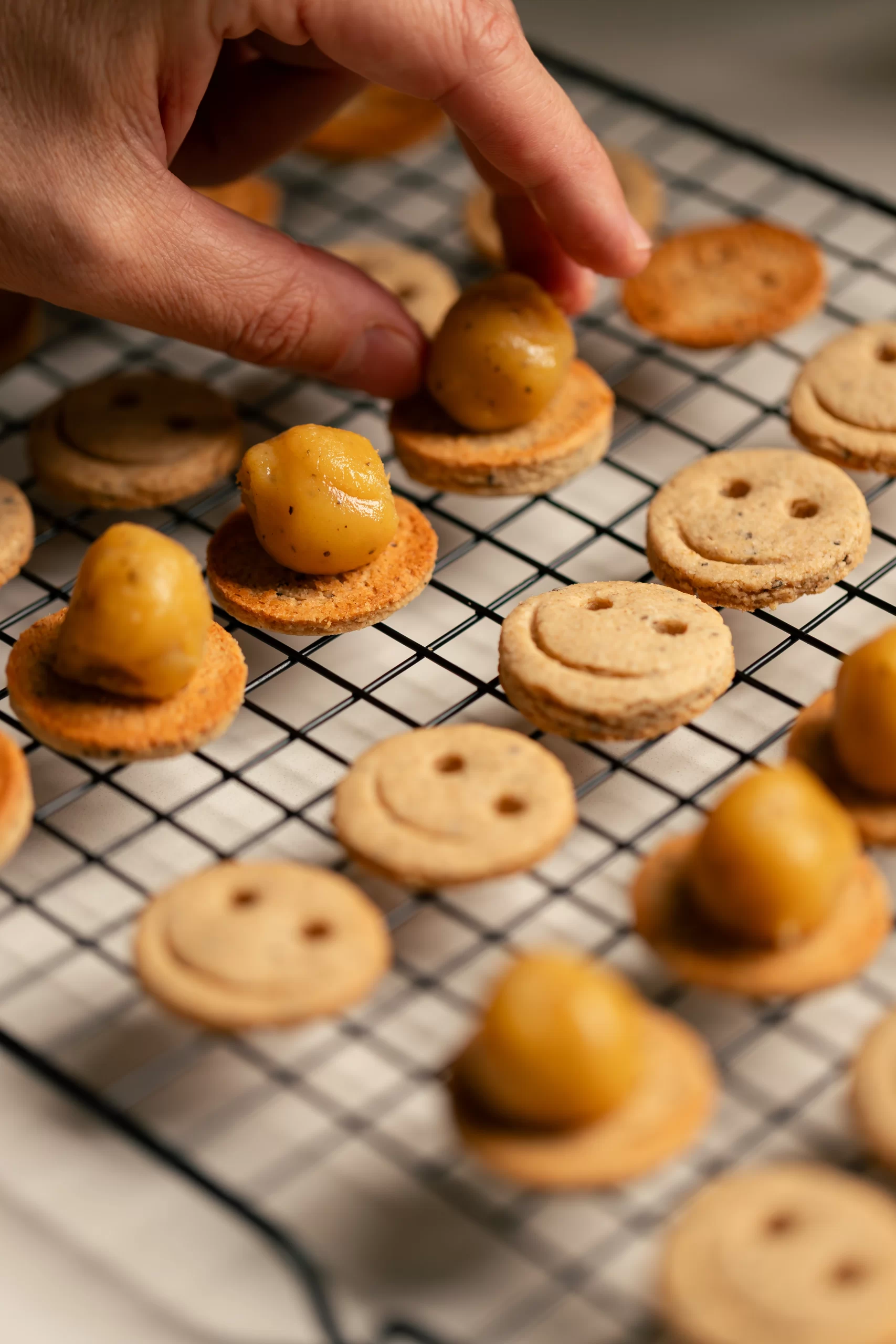 - Para rechear, modele o recheio da sua escolha em formato de círculo e coloque sob as metades dos biscoitos em que você não modelou um rosto.