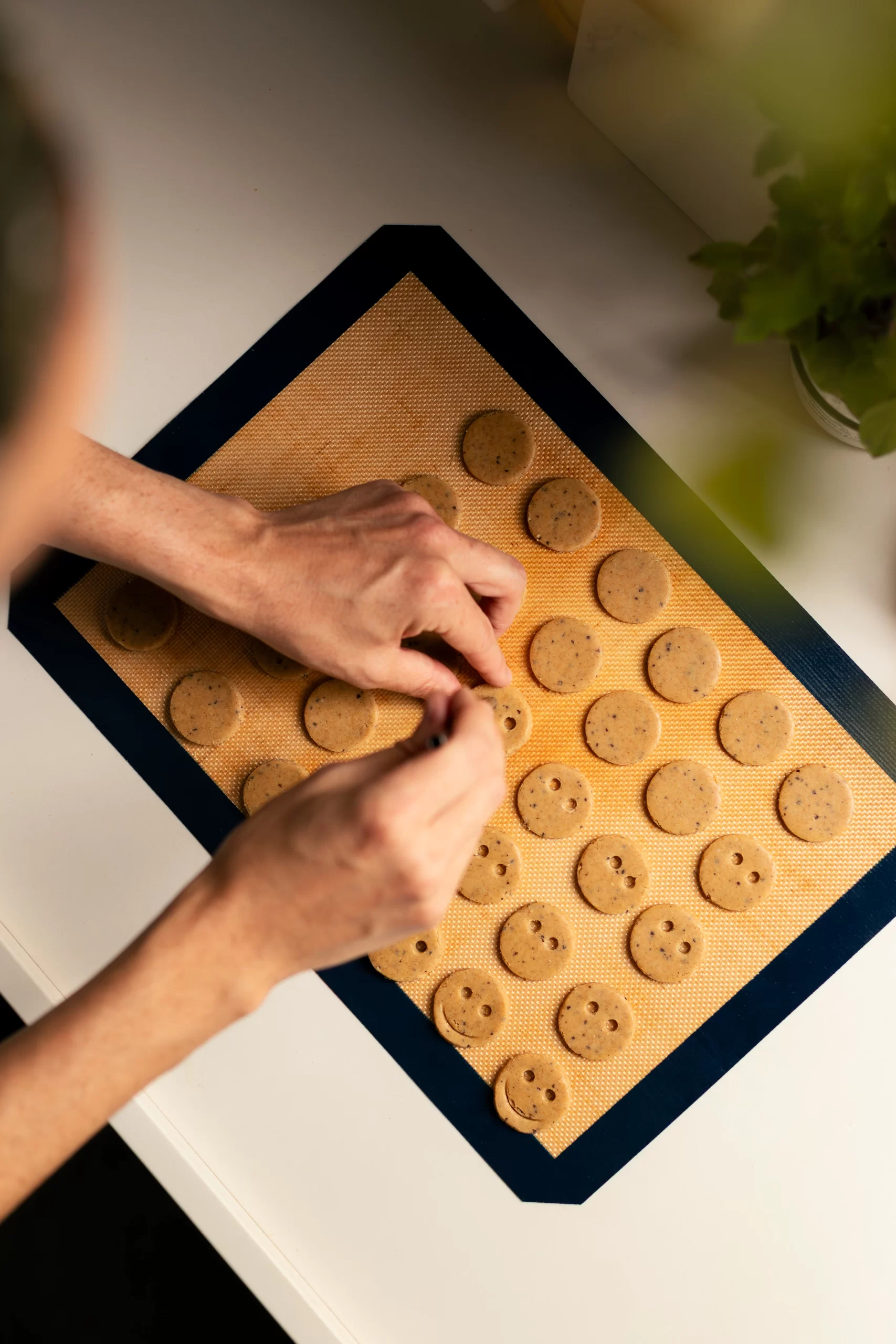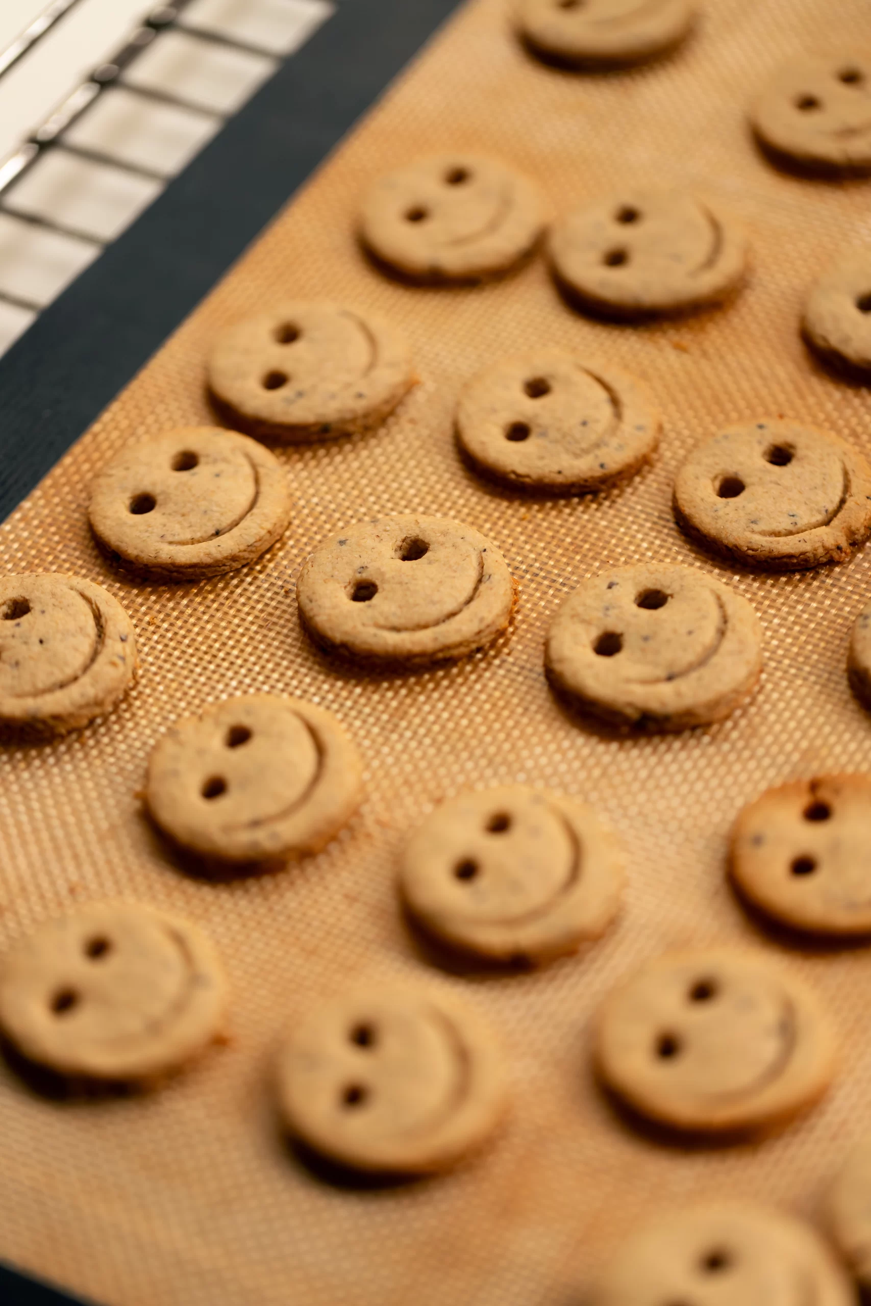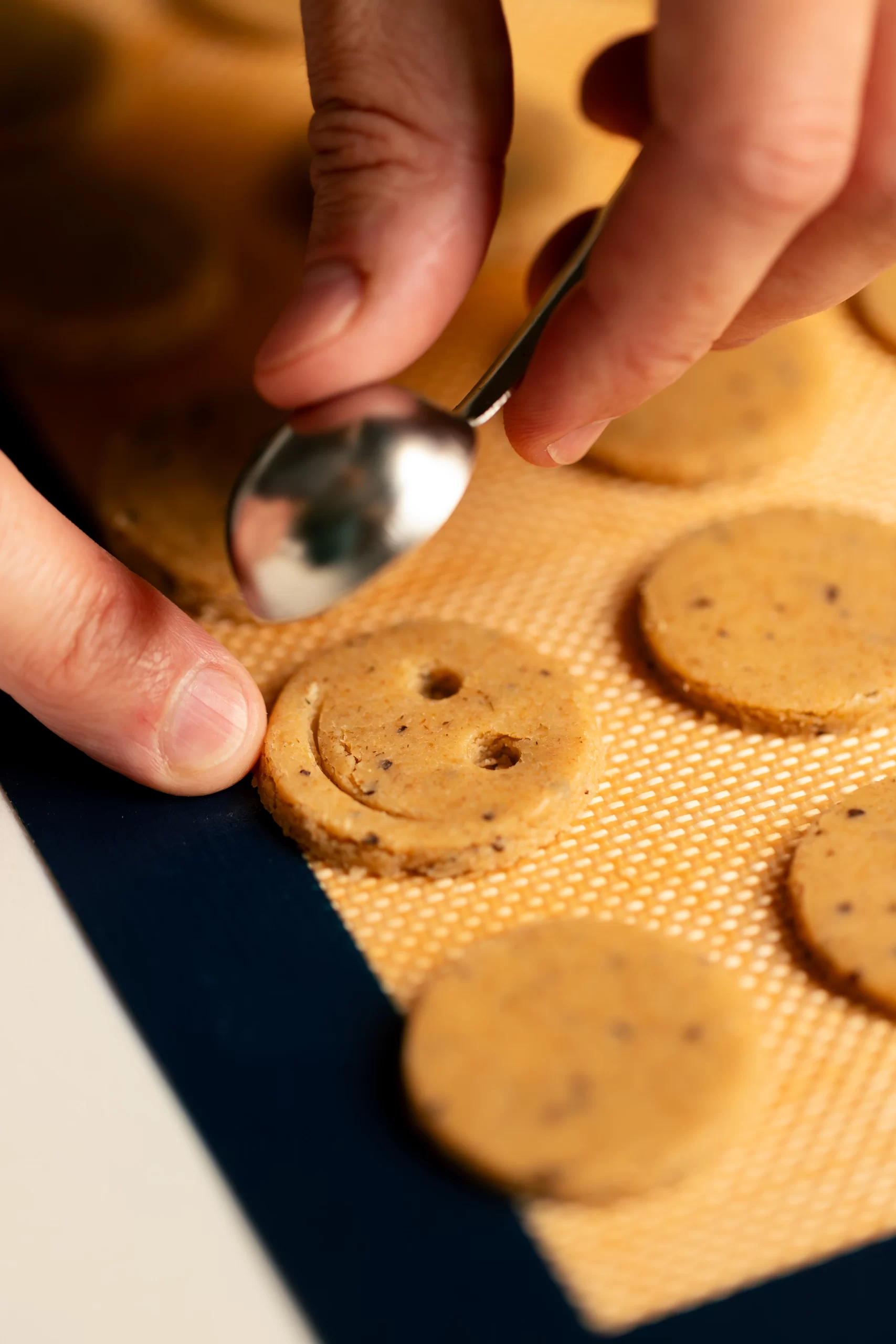 - Em seguida, disponha os círculos novamente em um tapete de silicone ou pedaço de papel manteiga e, apenas na metade da massa, modele o sorriso dos Trakinas com a ajuda de uma colher. Já para os olhos, utilize um canudo.